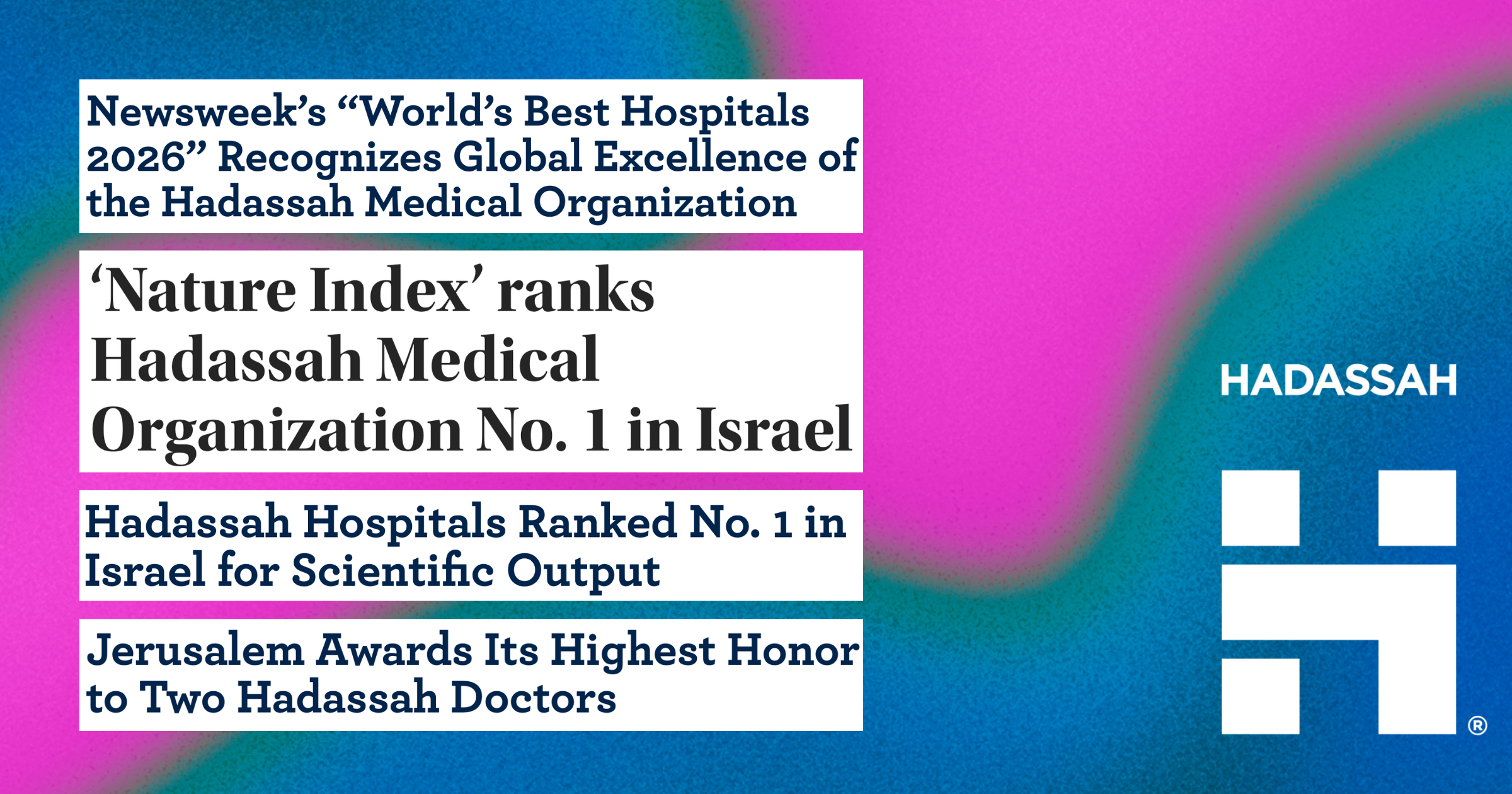 • The journal Nature named HMO the No. 1 hospital in Israel for scientific output; its Nature Index, which tracks primary research published in 145 leading nature- and health-science journals, found that, between 2024 and 2025, Hadassah was the most prolific producer of clinical-science research among Israeli hospitals and also ranked the medical center among the world’s top 200 hospitals in research papers.